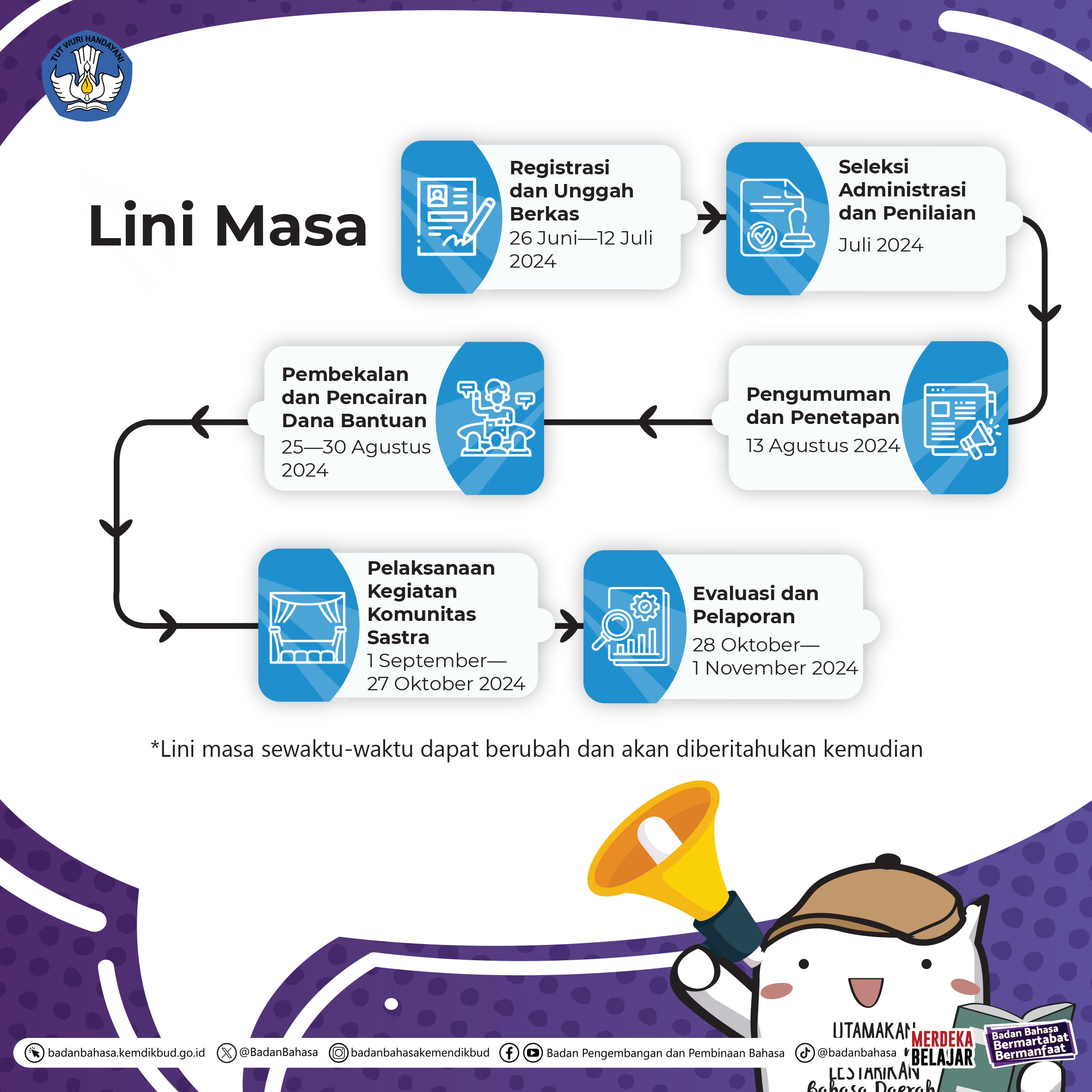 - Kelengkapan berkas bantuan pemerintah untuk perseorangan dilakukan dengan mekanisme usulan/rekomendasi dari Balai/Kantor Bahasa/Pusat Pengembangan dan Pelindungan Bahasa dan Sastra sesuai dengan wilayah kerja masing-masing dan diterima paling lambat 12 Juli 2024.